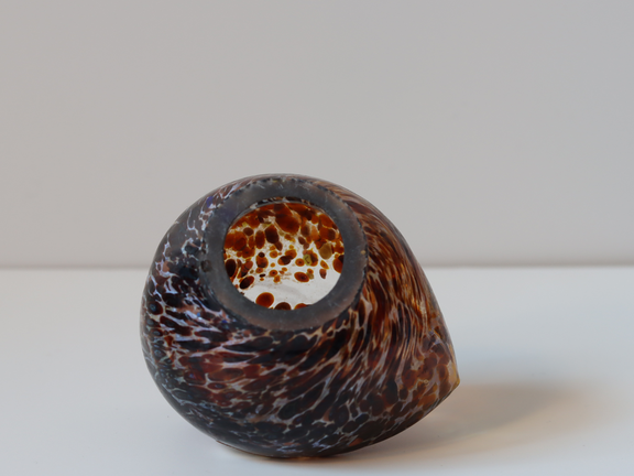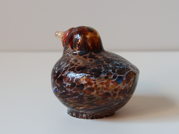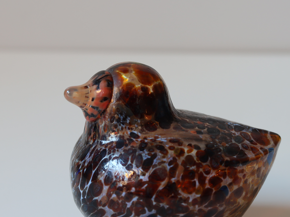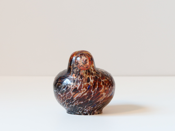 こちらはブラウンやブラックの濃い色を基調としたボディにオレンジ色のくちばしが付けられています。ところどころにオレンジ色のドット模様も入っていて、ハンドメイドならではの良さを感じます。全体的に透明感がありとても美しい作品です。