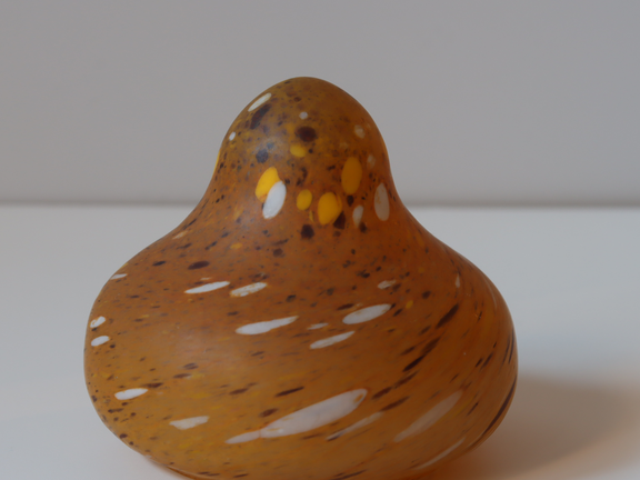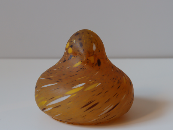 黄色のガラスに別の色の黄色や茶色、白のガラスが付けられています。目の窪みとくちばしの突起がさりげなく分かります。