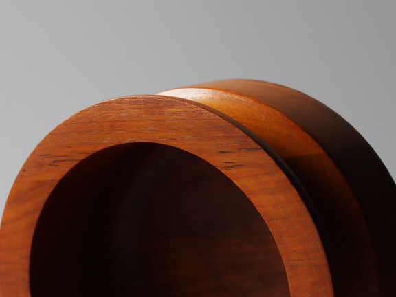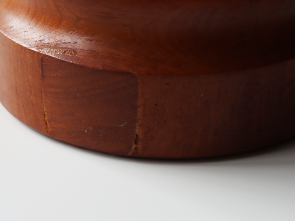 美しく経年変化を遂げたチーク材は、ヴィンテージならではの深みのある表情が魅力です。寄木によって成形され、やわらかなくびれを持たせたフォルムは、木の温もりと洗練されたデザイン性を併せ持っています。
