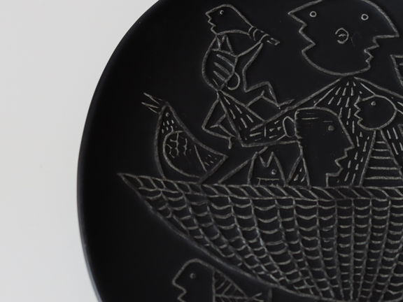 こちらは男性が漁をしているような姿を描いたもの。かごを手にした男性が漁をする情景を描いているようなデザイン。足元やかごには魚、男性には鳥が留まり、船上あるいは港の活気が伝わる構図です。