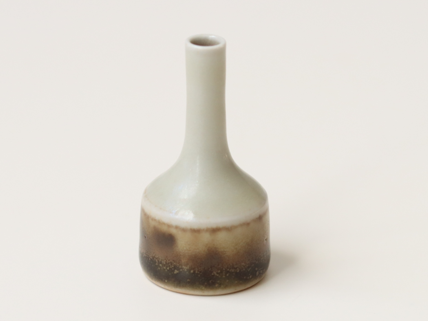 こちらは手でつまめる程のミニチュアのベースです。スッと細く伸びた口元と下部のムラのある釉薬が美しい作品。