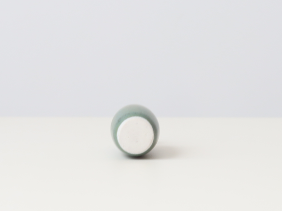 こちらは青緑色の流れるような釉薬が美しい個体。縁は白っぽくなっていてコントラストがあります。口元はくびれていて、繊細さを感じる作品です。