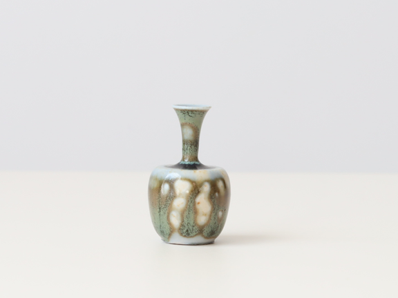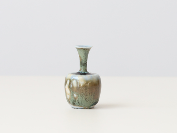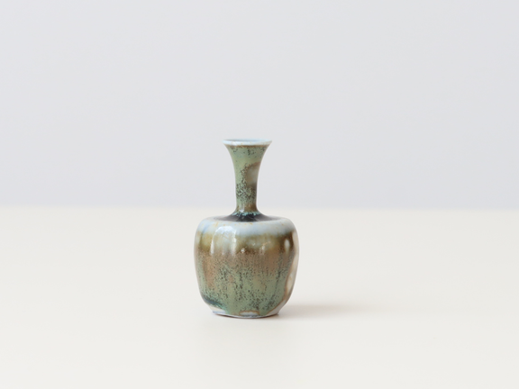 こちらは抹茶色と濃い茶色の釉薬が混ざった個体。どこか侘び寂びを感じます。口元はくびれていて、繊細な作品です。