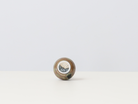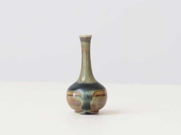こちらは若草色のような釉薬に茶色が混ざった個体。濃紺の釉薬のたまりがデザインのアクセントになっています。口元はくびれていて繊細な作品です。