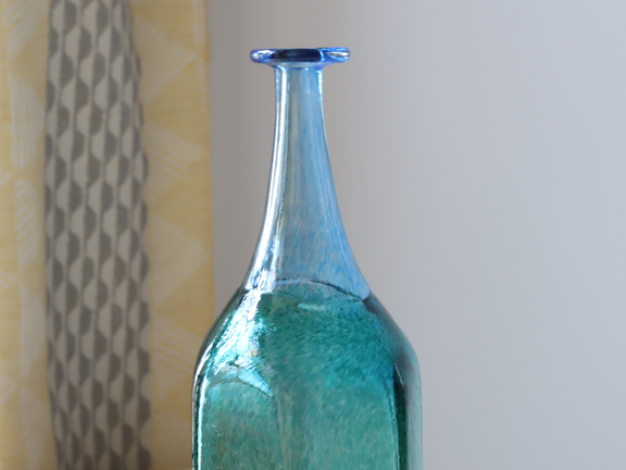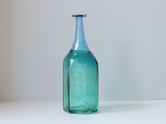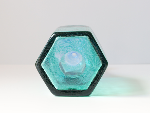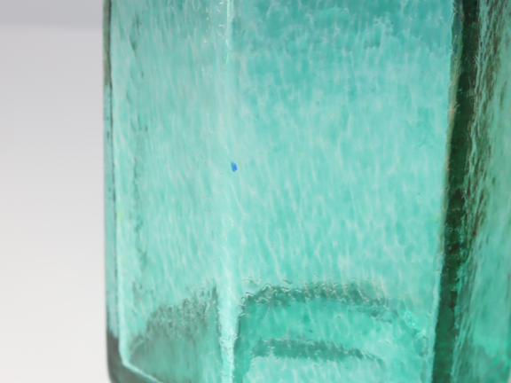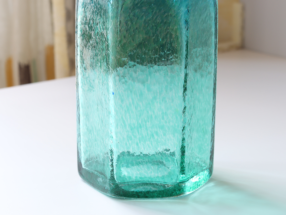 こちらは大きめの六角形のサイズのボトルで、下がグリーン、上がブルーの2トーンカラーです。まるで宝石のような輝きがあります。色の切替わり部分が角度によって異なる不均一さがハンドメイドの良さを感じさせます。