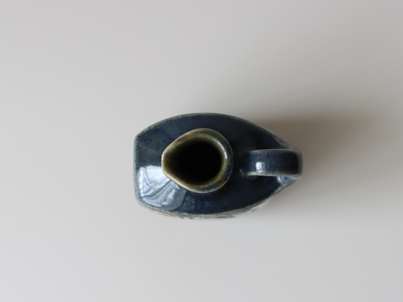 こちらはつるっとしたブルーの釉薬に白っぽい線で模様が描かれているハンドル付きのベースです。