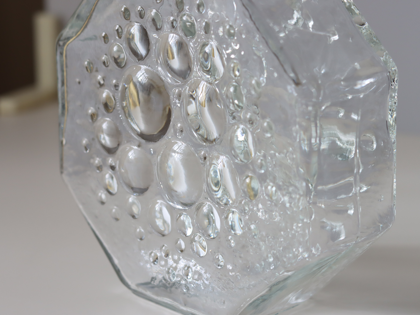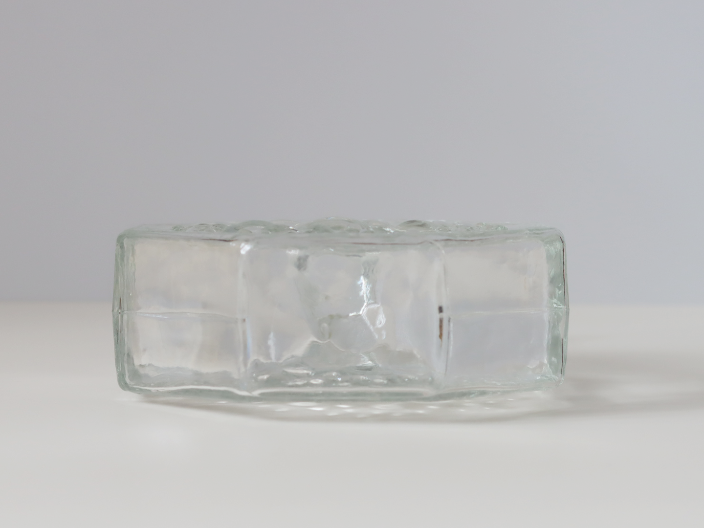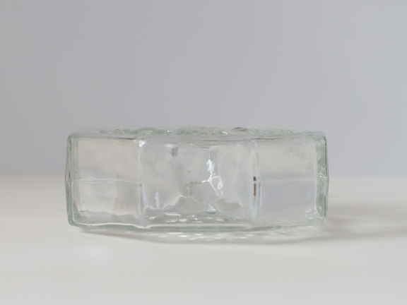 プレスガラスにより製造されていますが、丸く膨らんでいる凹凸には個体差があります。表裏で凹凸のパターンが異なるのも面白いところです。