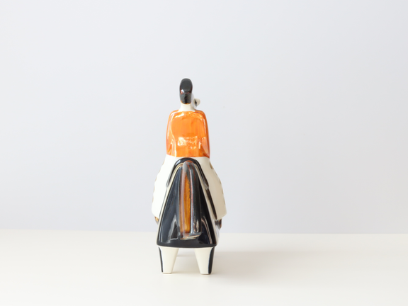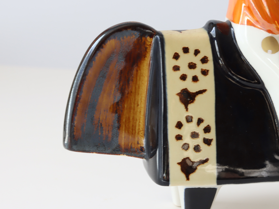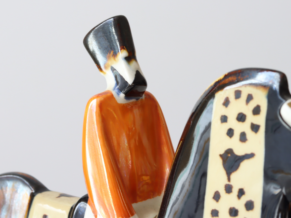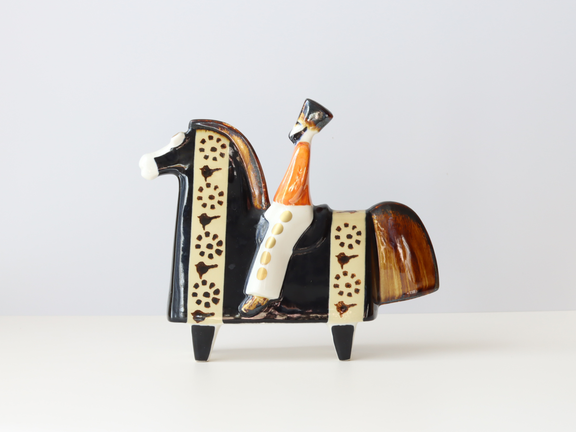 こちらは馬にまたがる男性のオブジェで、絵付けはハンドペイントによるもの。男性は正面を向いて馬にまたがっている様子です。女性のタイプもありますが、こちらの男性のタイプは一回り小さいサイズです。