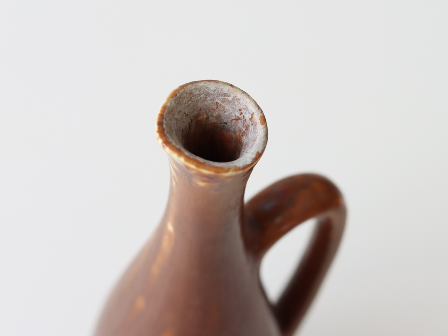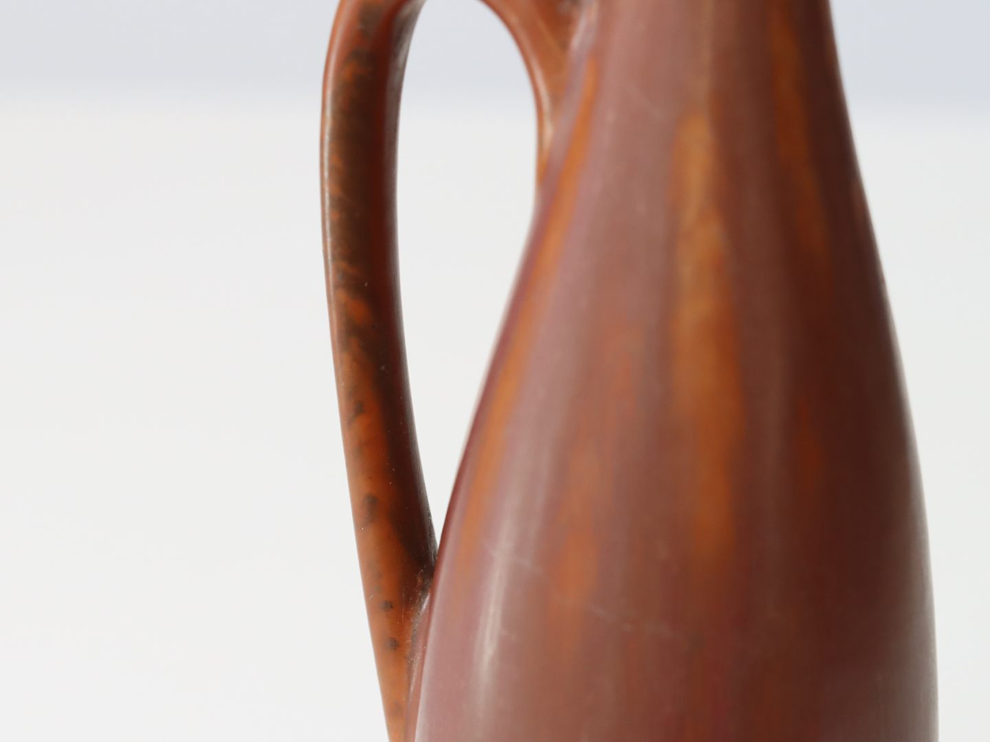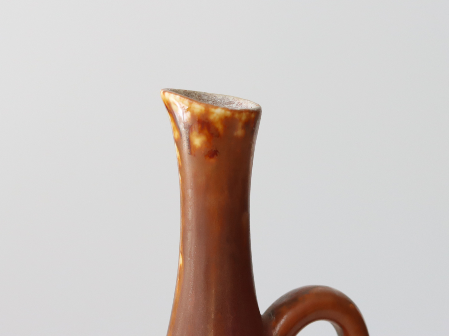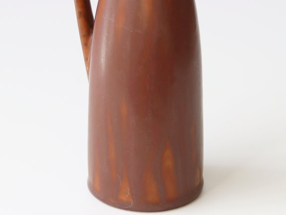 赤茶のようなカラーリングでところどこにムラ感があり、単色では無い複雑な表情をしているところも彼らしいデザインのように思います。口元付近の釉薬のムラ感が特に美しく釉薬の動きを感じさせます。