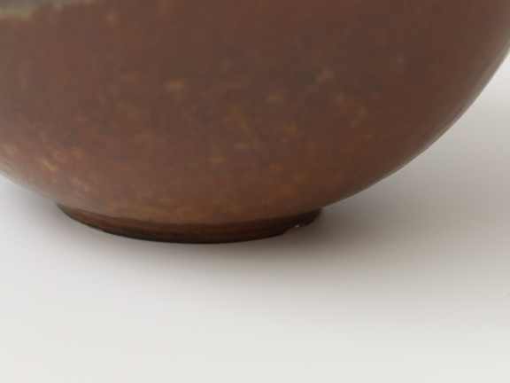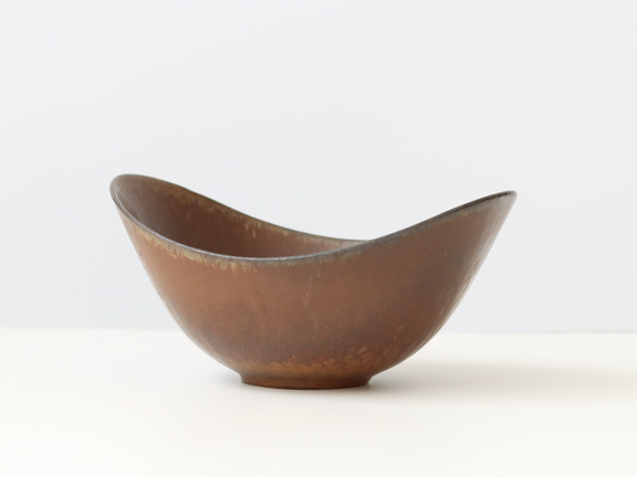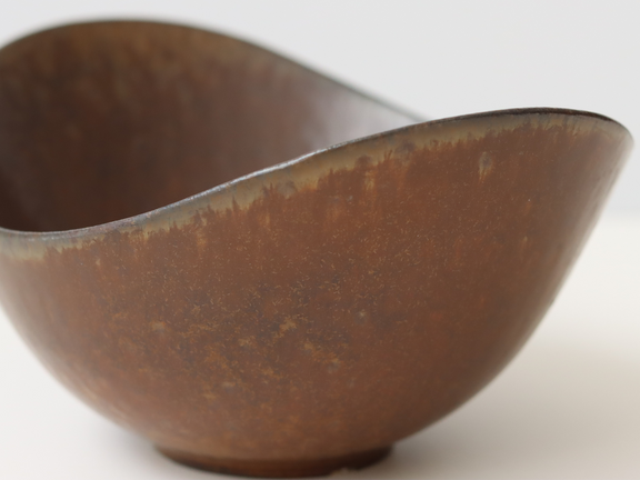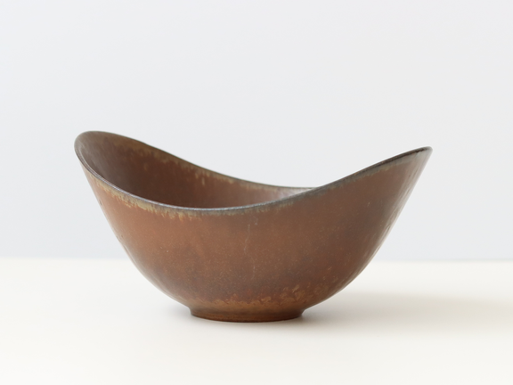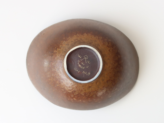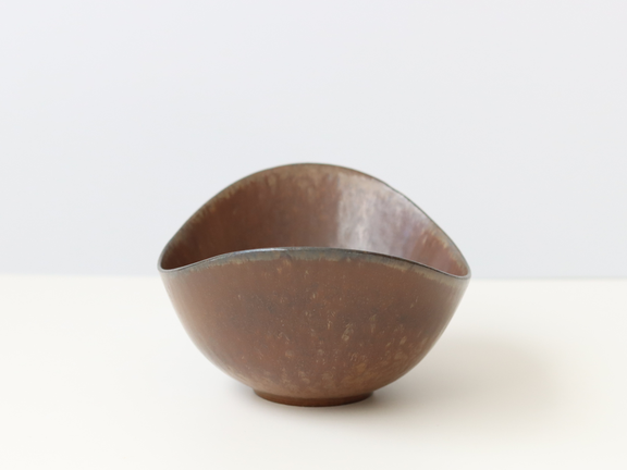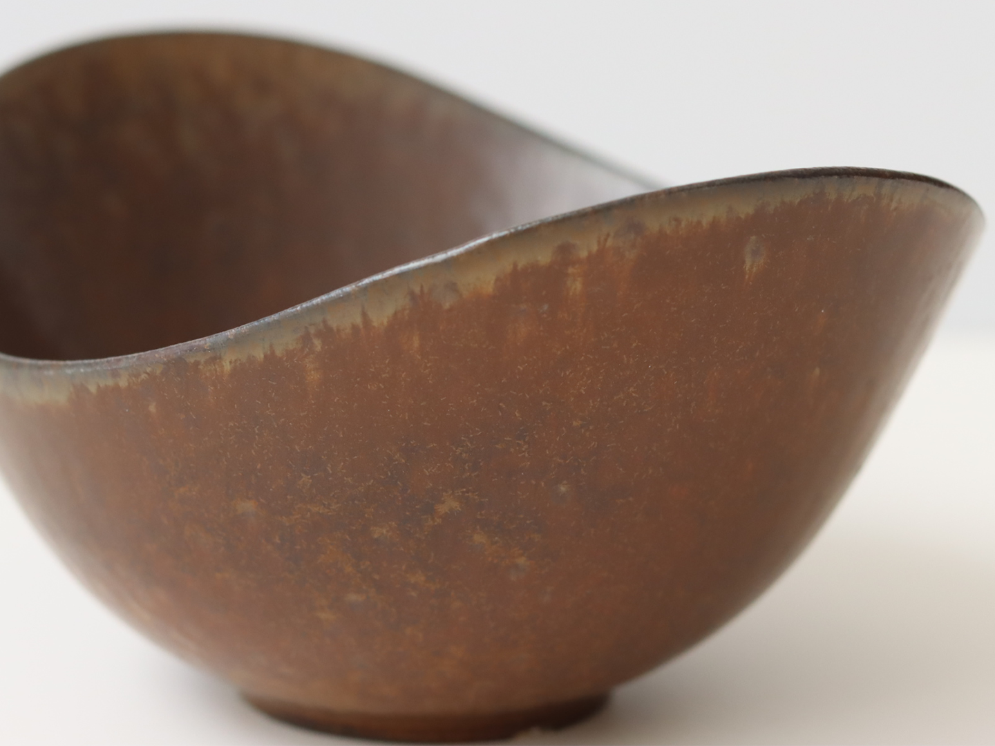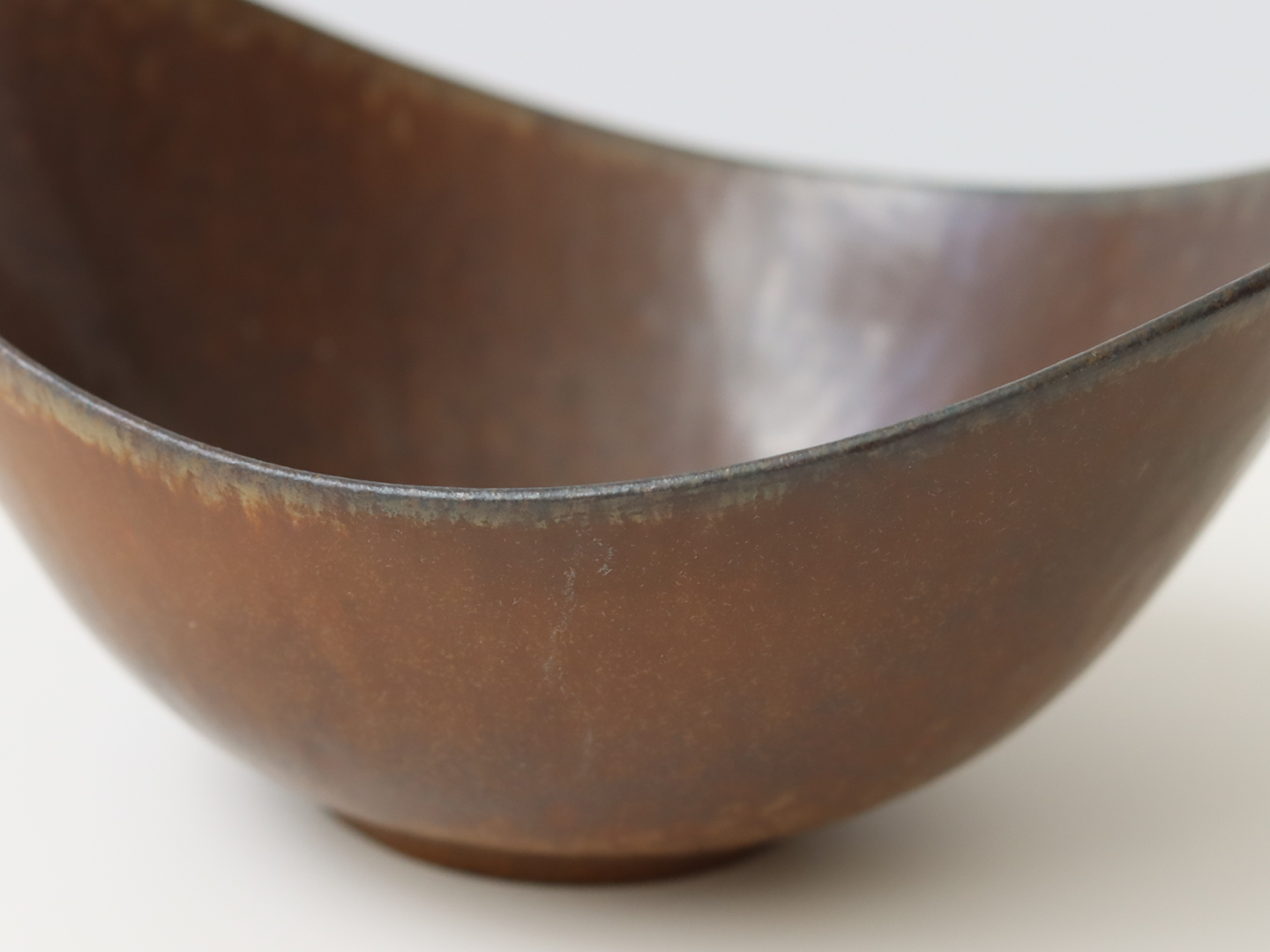 こちらは美しい造形美をしたボウル。彼の代表作でもあり、流線型の縁が特に美しく、ブラウンの釉薬が混ざり合う様に美しく表現されています。単色ではない複雑な釉薬が魅力的です。