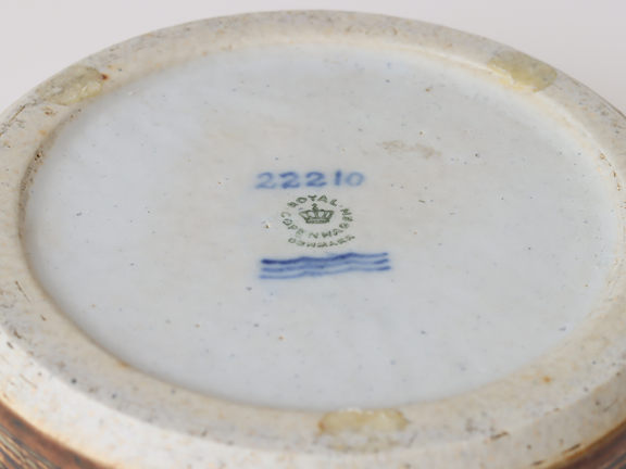Aluminiaは1863年創業のファイアンス工房で、1882年にRoyal Copenhagenを傘下に収め、両者は長く別ブランドとして運営されました。1969年に「Aluminia」名義が終わり、以後ファイアンス作品は “Royal Copenhagen Denmark Fajance” の名で展開されます。