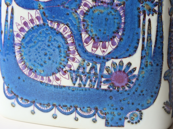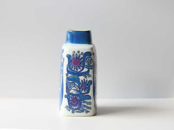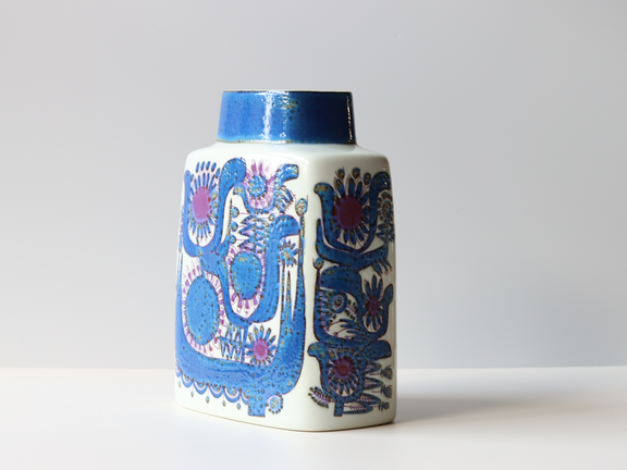 草花や鳥などのモチーフを、ブルーを基調とした伸びやかな筆致で描き出すスタイルが特徴で、現在も北欧ヴィンテージコレクターから高く評価されています。